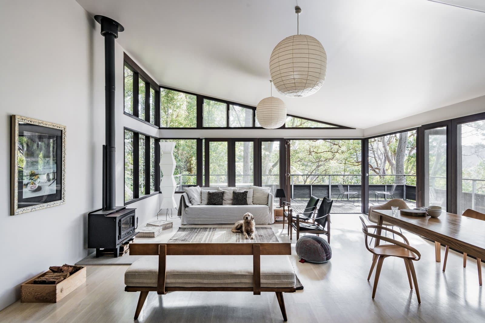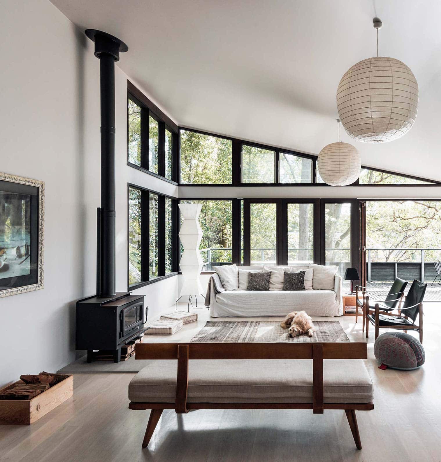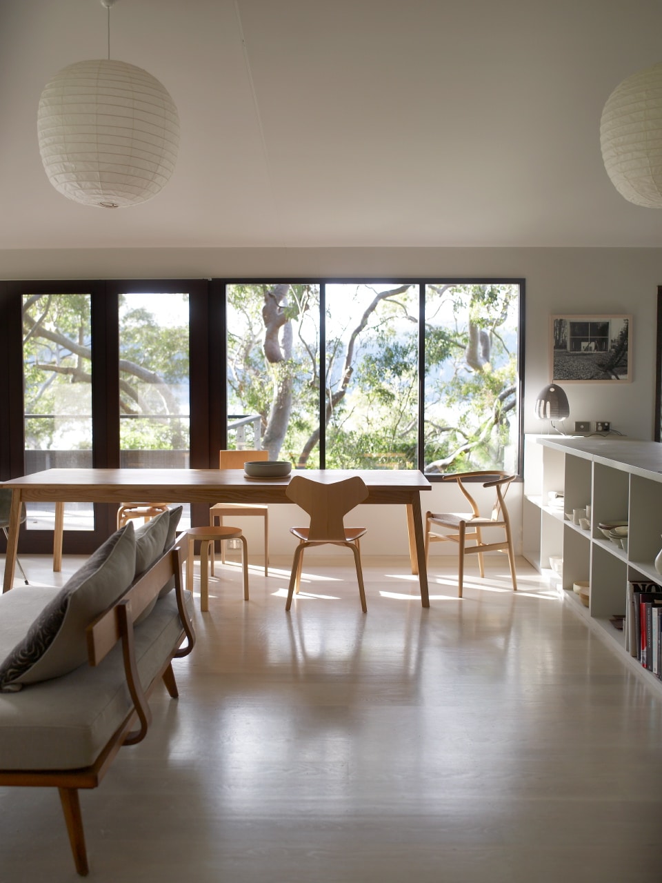 The home’s open living space is dotted with iconic design classics including wishbone dining chairs, Noguchi lamps, Carl Hansen safari chairs and Serge Mouille wall lights. The clean lines and lack of clutter draw your eye to each one of them, their lines, curves and natural materials melding seamlessly with the surroundings.